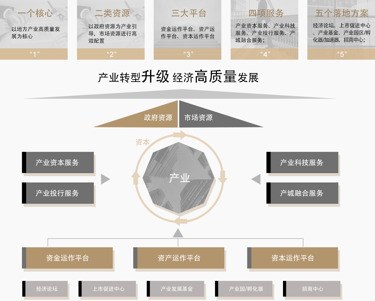優(yōu)勢資本為地方政府提供“12345”資本整體解決方案,以資本助力地方產(chǎn)業(yè)轉(zhuǎn)型升級,推動區(qū)域經(jīng)濟高質(zhì)量發(fā)展。