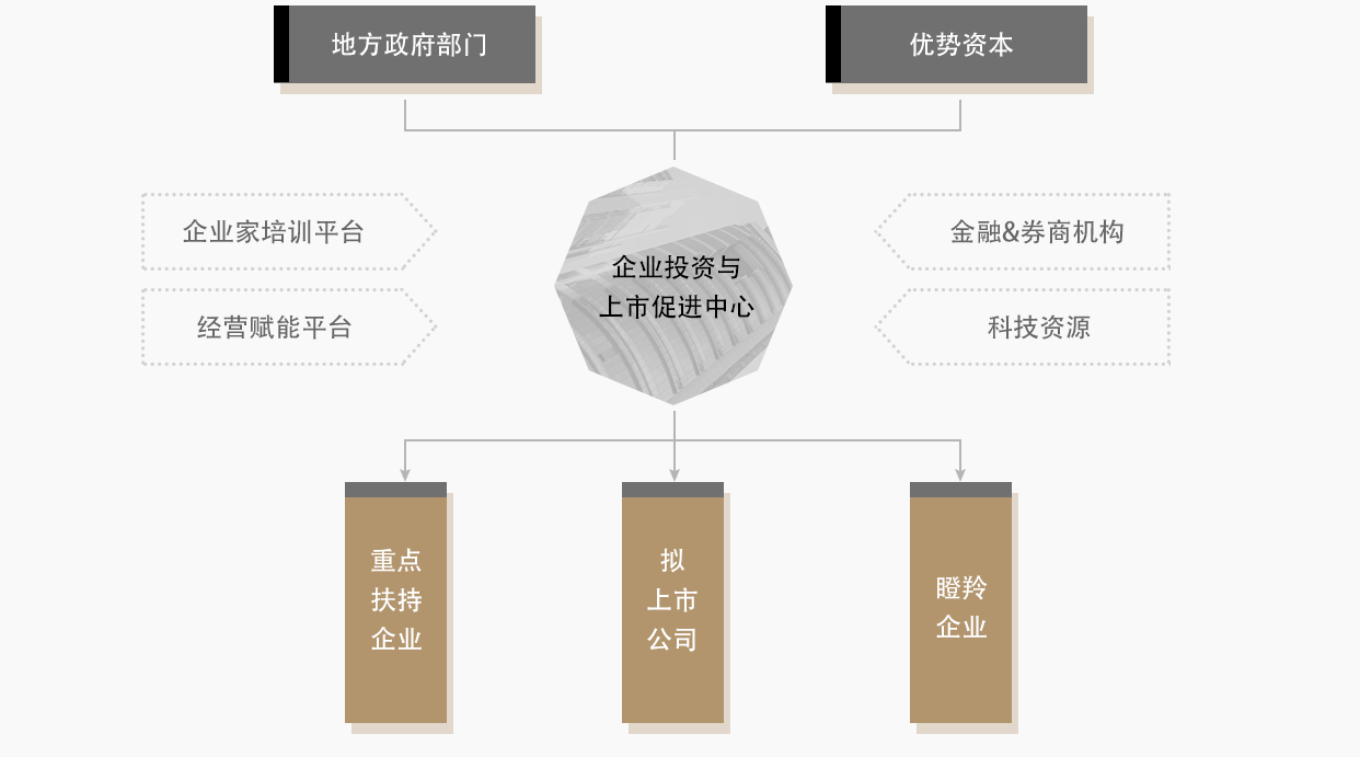 優(yōu)勢(shì)資本與地方政府合作成立的平臺(tái),旨在給當(dāng)?shù)仄髽I(yè)提供包括資本培訓(xùn)、上市顧問服務(wù)、私募股權(quán)融資等金融與賦能服務(wù),為企業(yè)導(dǎo)入產(chǎn)業(yè)資源、科技資源,借助資本的力量進(jìn)行產(chǎn)業(yè)整合,推動(dòng)具有企業(yè)家精神、經(jīng)營基礎(chǔ)良好的企業(yè)實(shí)現(xiàn)跨越式發(fā)展,并進(jìn)入資本市場(chǎng)。
