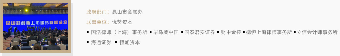 2019年12月12日,由昆山市金融辦主導(dǎo),優(yōu)勢(shì)資本聯(lián)合券商、投資機(jī)構(gòu)、律師事務(wù)所、會(huì)計(jì)師事務(wù)所和投資機(jī)構(gòu)成立“昆山科創(chuàng)板上市服務(wù)聯(lián)盟”掛牌成立,為當(dāng)?shù)鼐哂泻诵募夹g(shù)的成長(zhǎng)型企業(yè)提供綜合服務(wù),對(duì)接資本市場(chǎng)。
