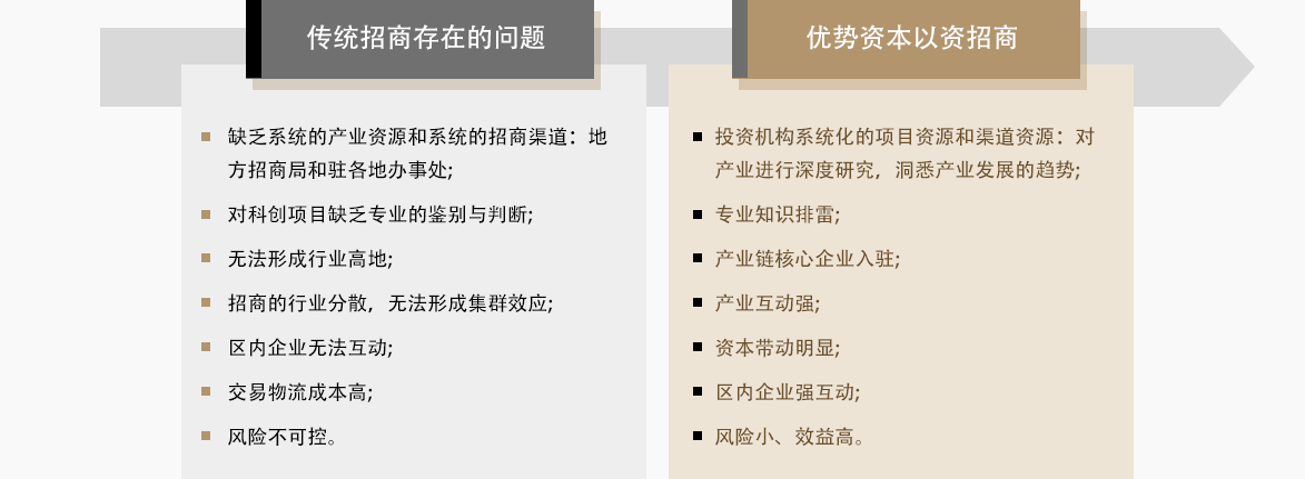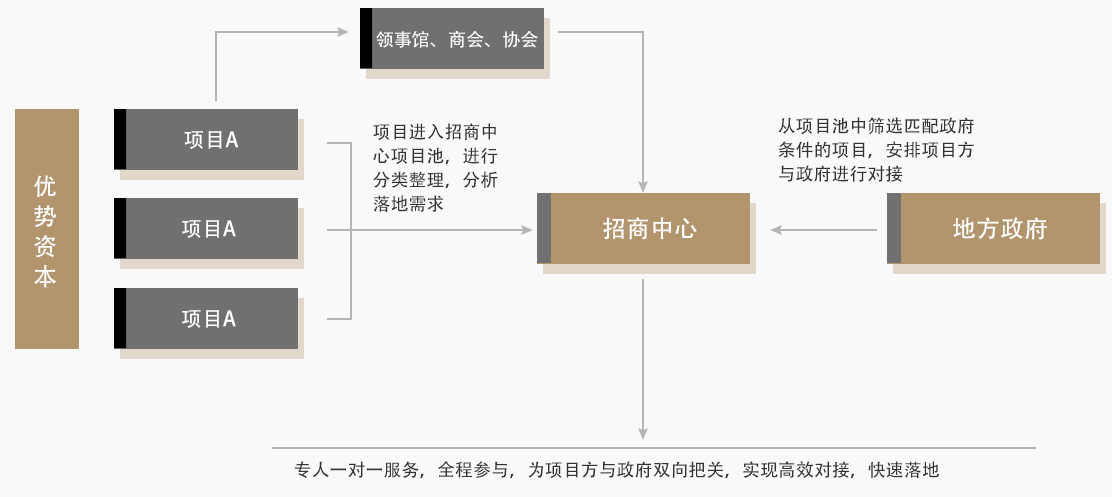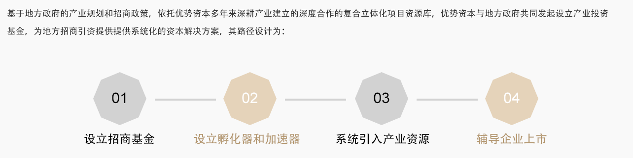 優(yōu)勢(shì)資本與政府共同成立招商中心,依托優(yōu)勢(shì)資本的產(chǎn)業(yè)資源項(xiàng)目庫和廣泛的資訊渠道,為地方政府進(jìn)行精準(zhǔn)招商。