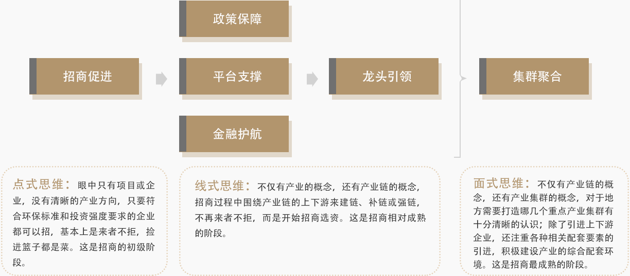借助資本的力量,產(chǎn)業(yè)集群招商六步:招商促進(jìn)、政策保障、平臺(tái)支持、金融護(hù)航、龍頭引領(lǐng)、集群聚合。