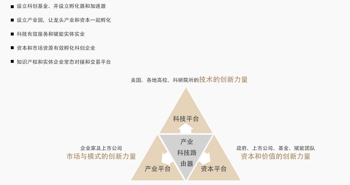 緊緊圍繞“資本主導、產(chǎn)業(yè)路由、異地孵化、離岸加速、本地整合”五大目標,通過產(chǎn)業(yè)引導基金投資的形式,整合行業(yè)資源,將有核心技術的高校院所和高校人才、有市場的企業(yè)和市場人才以及資金和資本有效結(jié)合,形成資本-科技-產(chǎn)業(yè)為一體的產(chǎn)業(yè)科技路由器,為地區(qū)政府打造資本創(chuàng)新總部群。